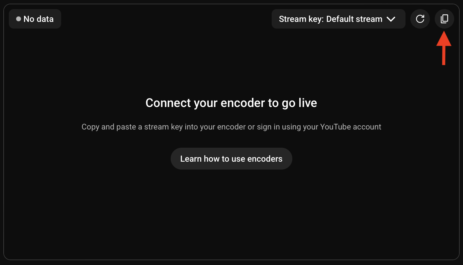 - After selecting the desired stream in the Stream Key popup menu, click the Copy button to the right of the Stream Key popup, as indicated by the red arrow in the image above. This copies the stream key to the clipboard.