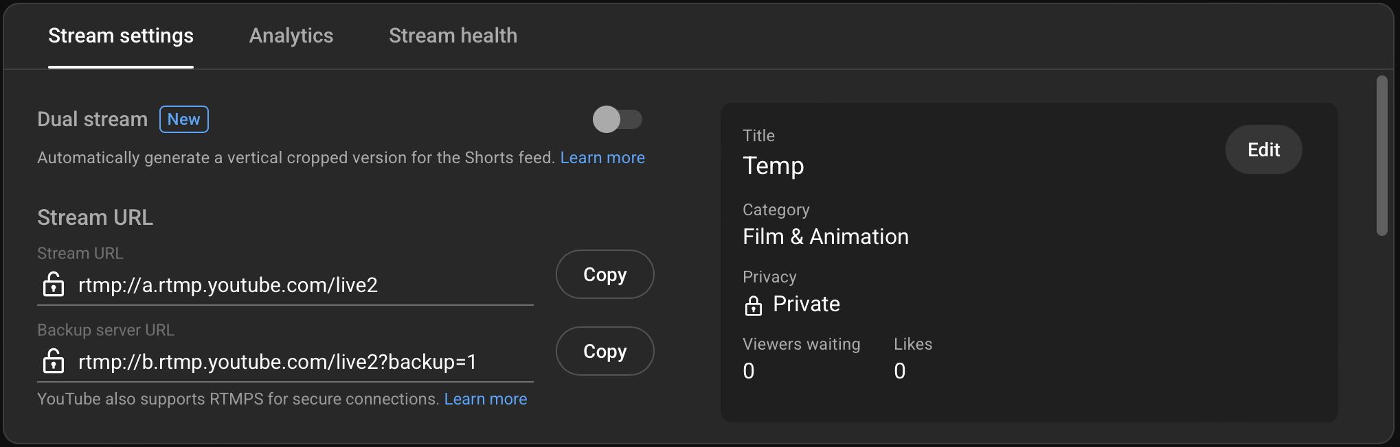 - After setting the Title and Privacy for your stream, click the Copy button to the right of the Stream URL. This copies the Stream URL to the clipboard.